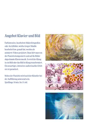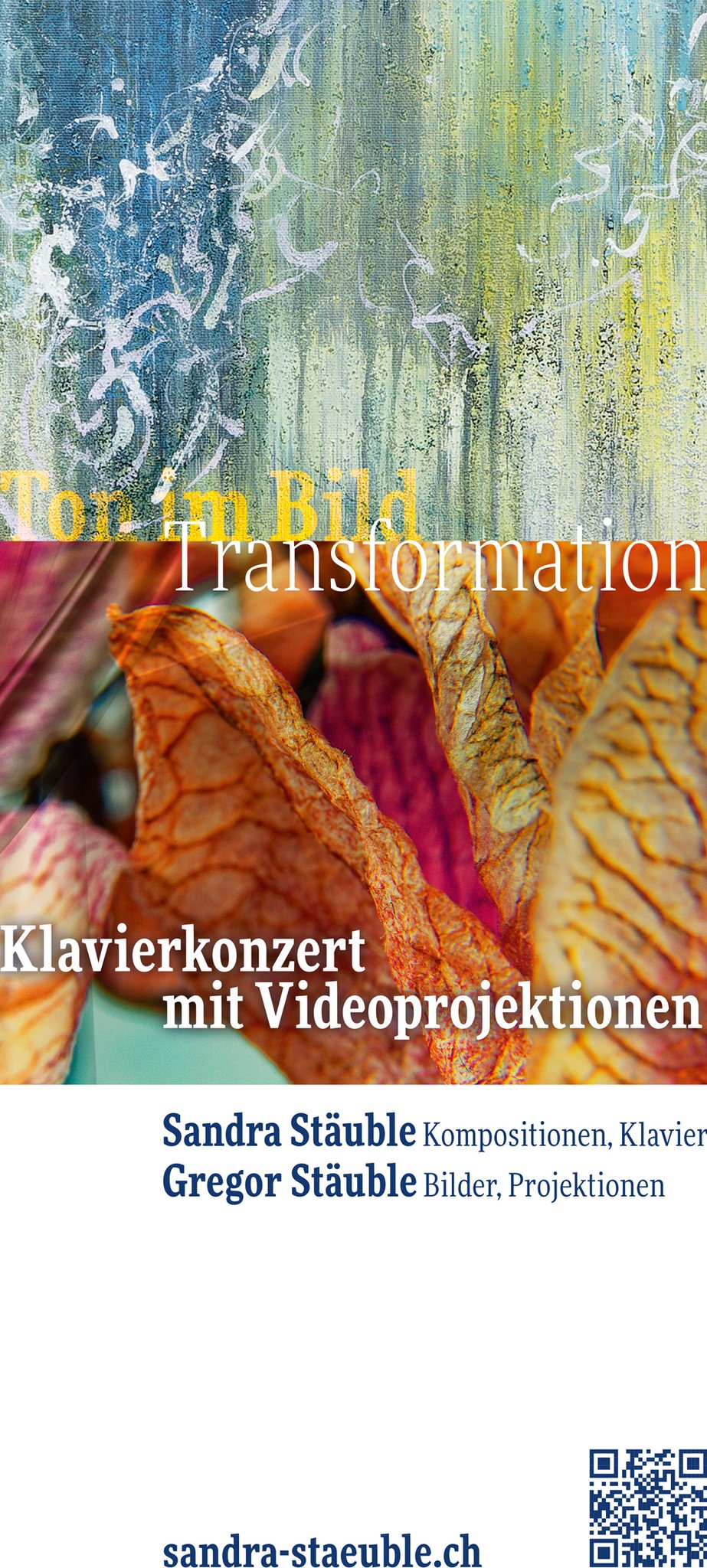 Die Werke des Künstlerehepaars verbinden sich auf audiovisueller Ebene. An den Aufführungen sind Eigenkompositionen von Sandra Stäuble zu hören, welche Acryl-Bilder und digital bearbeitete Makro-Fotografien (jeweils von Gregor Stäuble) in Klaviermusik verwandeln. Die Essenz der Bilder wird in Ton, Rhythmus und Melodie transformiert. Das Ineinanderspielen von Klaviermusik und projizierten Videoanimationen verspricht ein intensives Erlebnis für das Publikum zu werden.