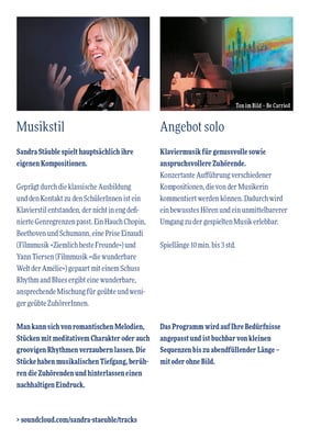 Die Klavierkompositionen von Sandra Stäuble haben musikalischen Tiefgang, berühren die Zuhörenden und hinterlassen einen nachhaltigen Eindruck. Die Videoprojektionen